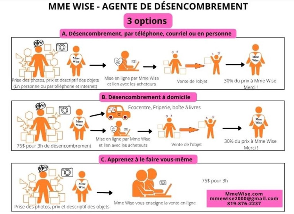 Parfois, certaines personnes préfère que j’aille chez elle pour faciliter le désencombrement. J’y vais par bloc de 3h au coût de 75$. Je peux apporter vos objets aux centres de récuperation (ecocentres), aux comptoirs familiaux et déposer les livres dans les boîtes à livres.